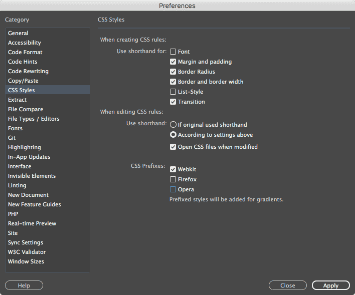- For more information about preferences you will need to search for them by category in Dreamweaver's
